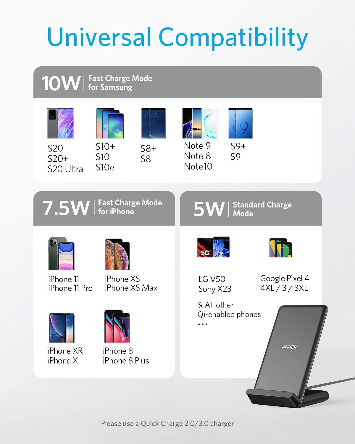Quick Charge 2.0/3.0 wall adapter required for Fast Charge Mode.