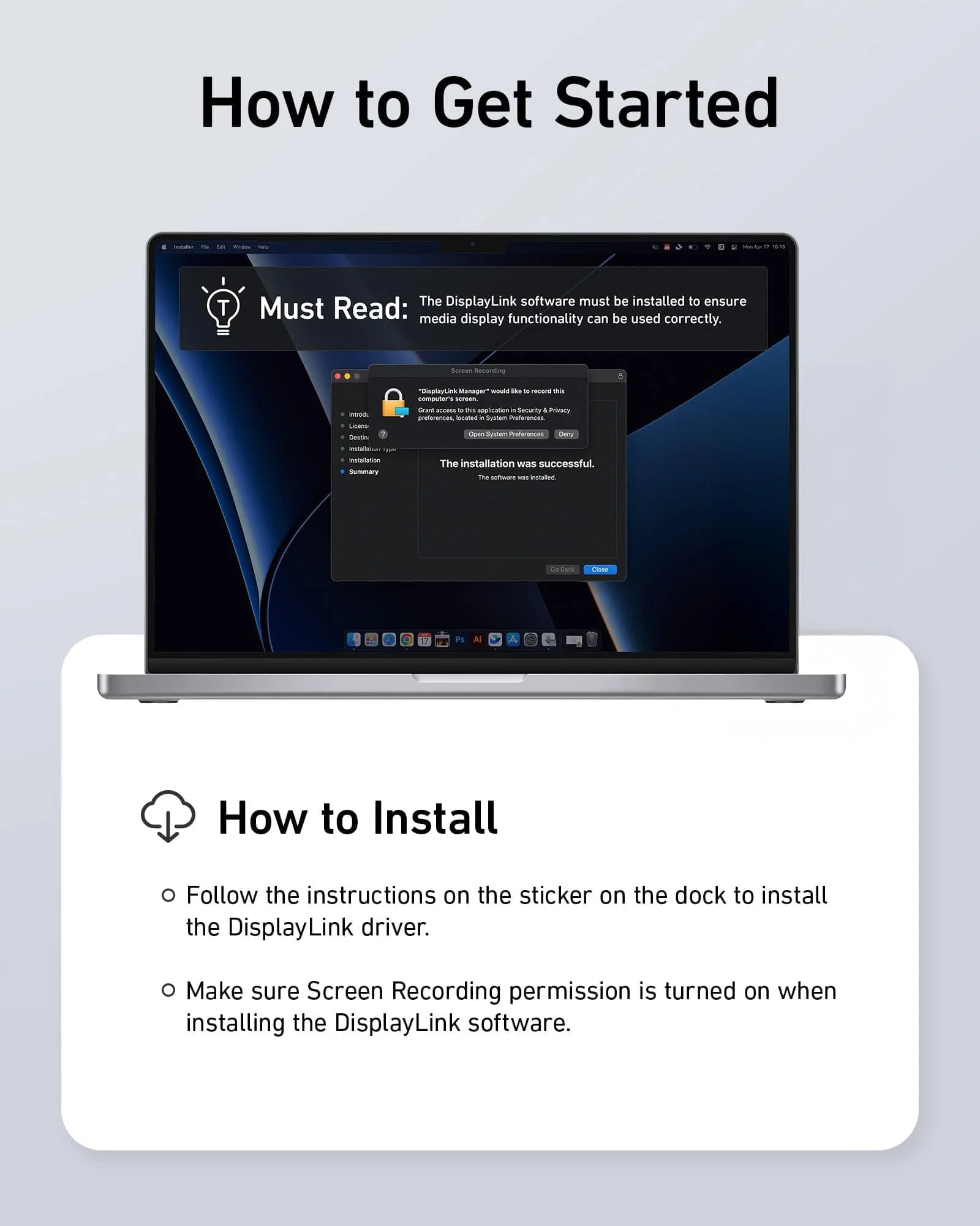 The Displaylink needs to be installed, and Screen Recording permission needs to be turned on when the DisplayLink software is installed. Otherwise, the 2K HDMI port and 2K DisplayPort can not be used normally. This permission is required to ensure normal port functionality; it will not be used for other purposes, and your privacy will be secured.