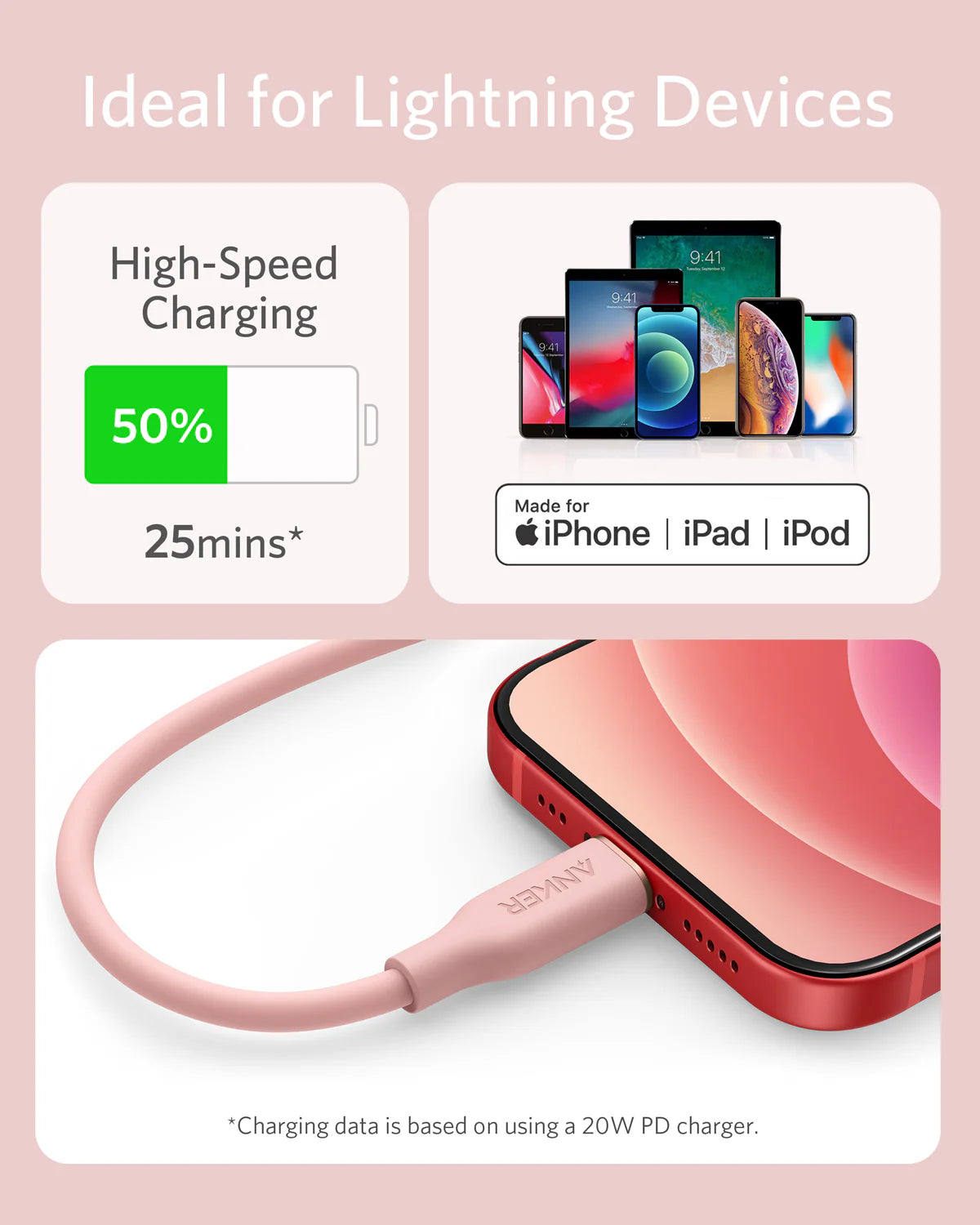 MFi certified to work flawlessly with all of your Lightning devices, including iPhone 12 and iPad. Safely charge your device at its highest possible speed when connected to a Power Delivery high-speed charger.