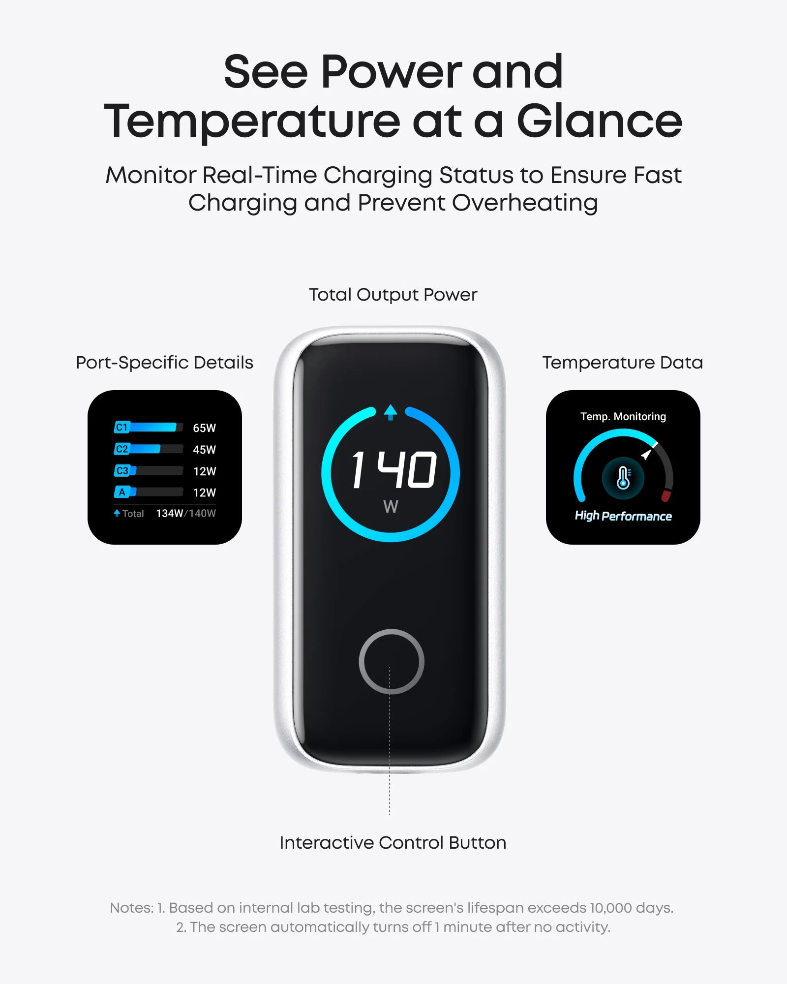 The high-definition color display provides a detailed view of the charging status, temperature, and port details, keeping you fully informed.