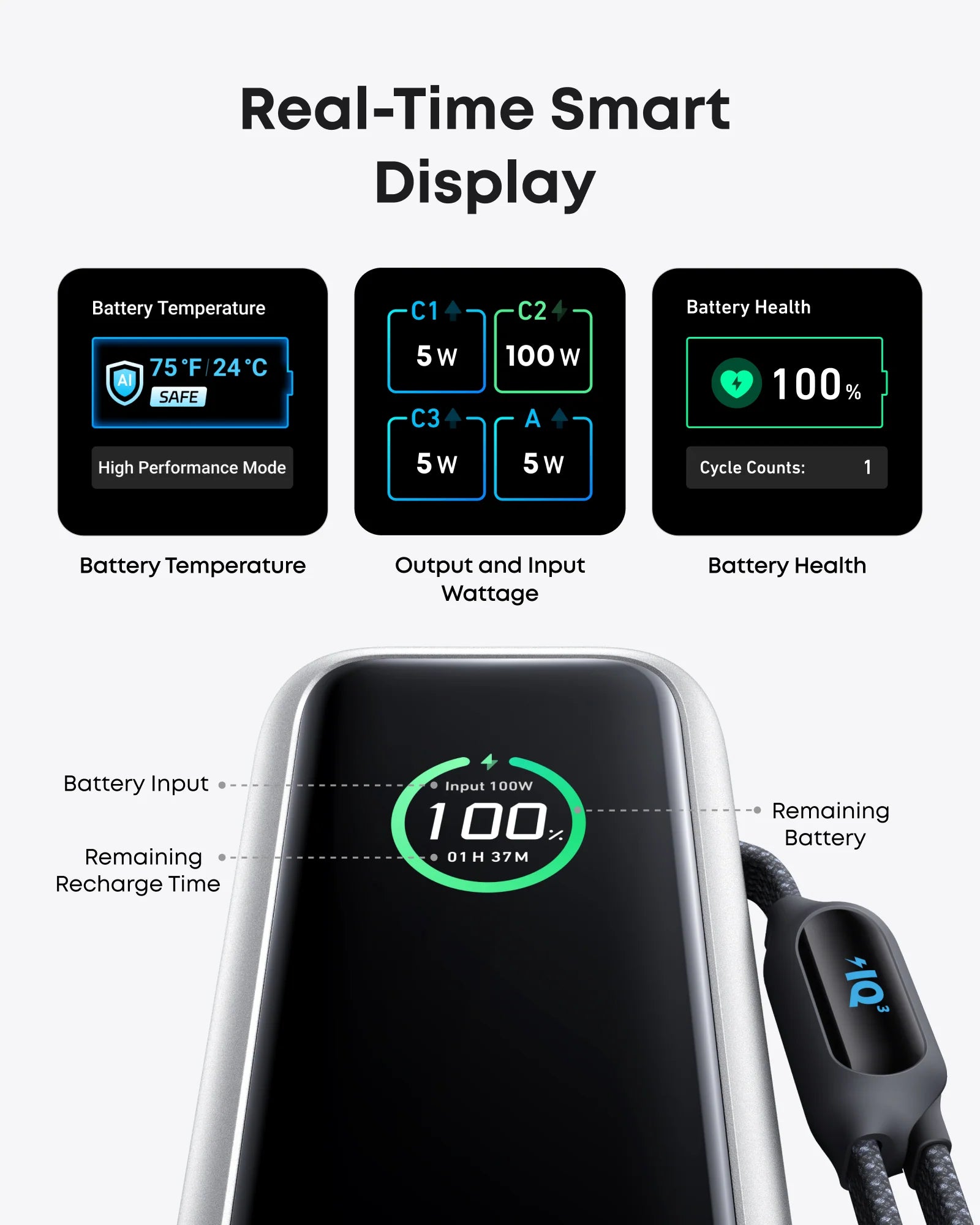 Set off on extended journeys with a huge 25,000mAh capacity that supports your devices through multiple uses, complete with 100W ultra-fast recharging that fuels the power bank to 30% in just 20 minutes.