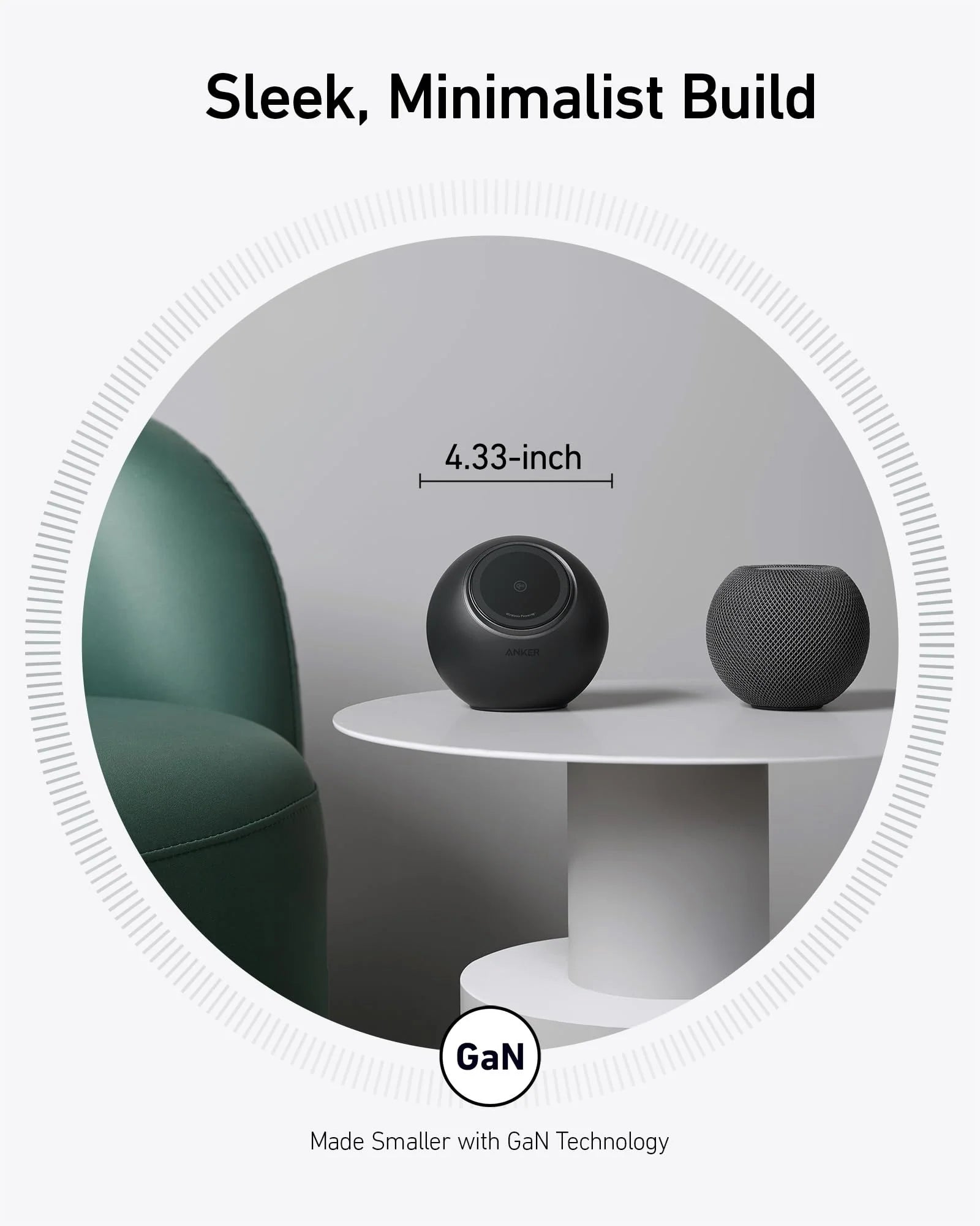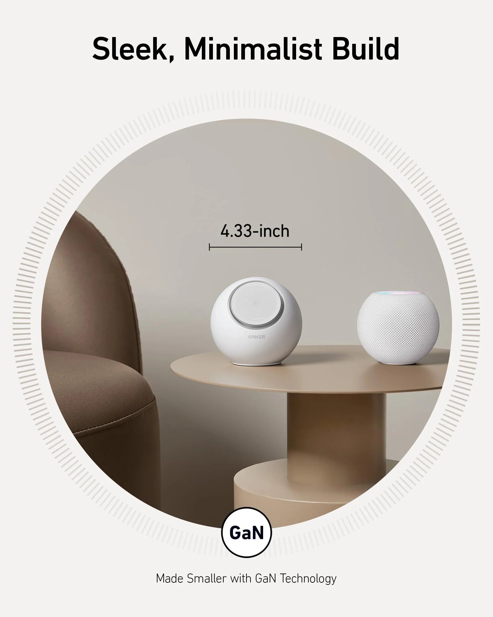Enjoy a streamlined setup with concealed rear outlets, ensuring a clean desktop and saving space with a size comparable to a HomePod Mini.