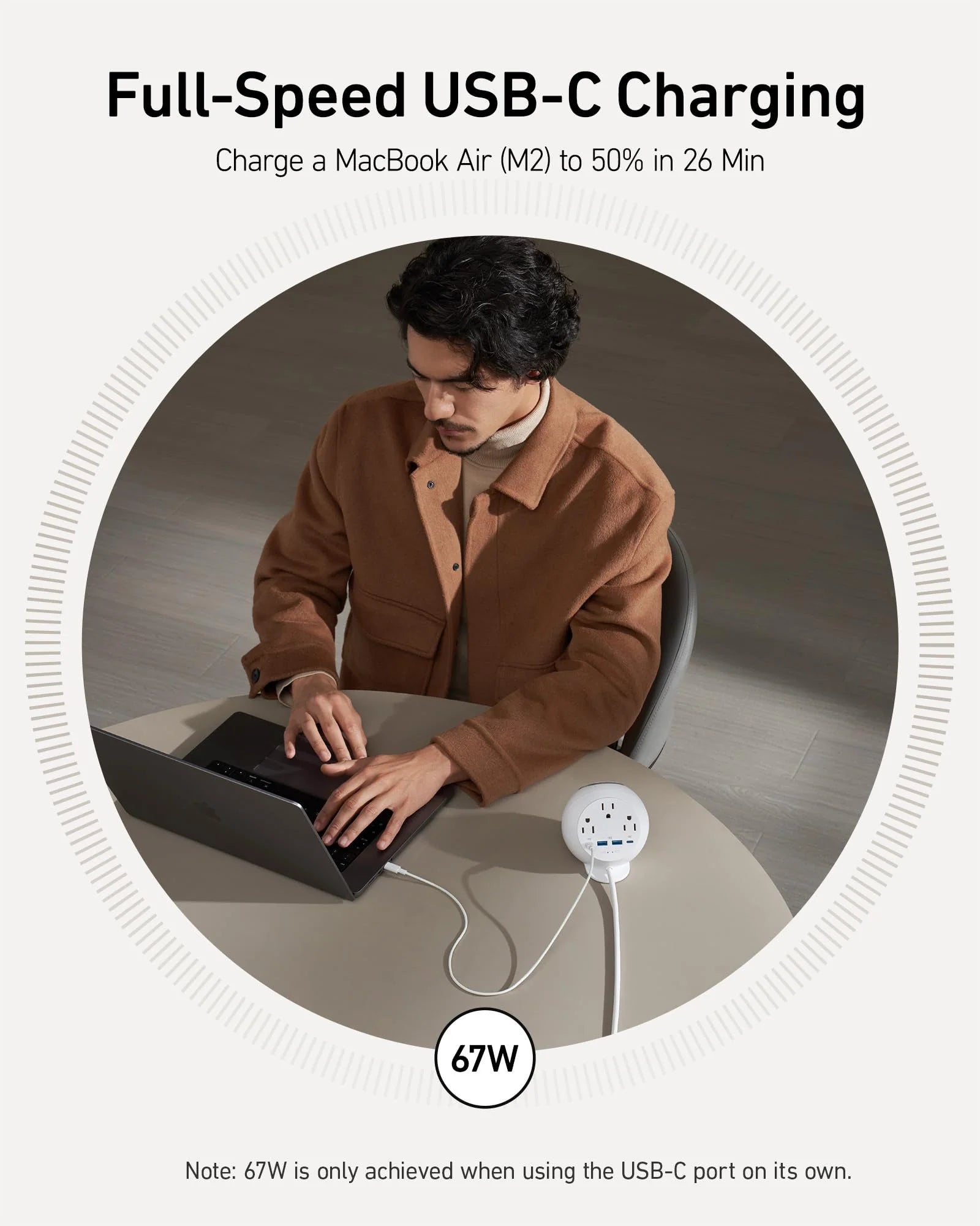 Boost your MacBook Air's battery to 50% in just 26 minutes with the powerful 67W USB-C port, maximizing charging efficiency.