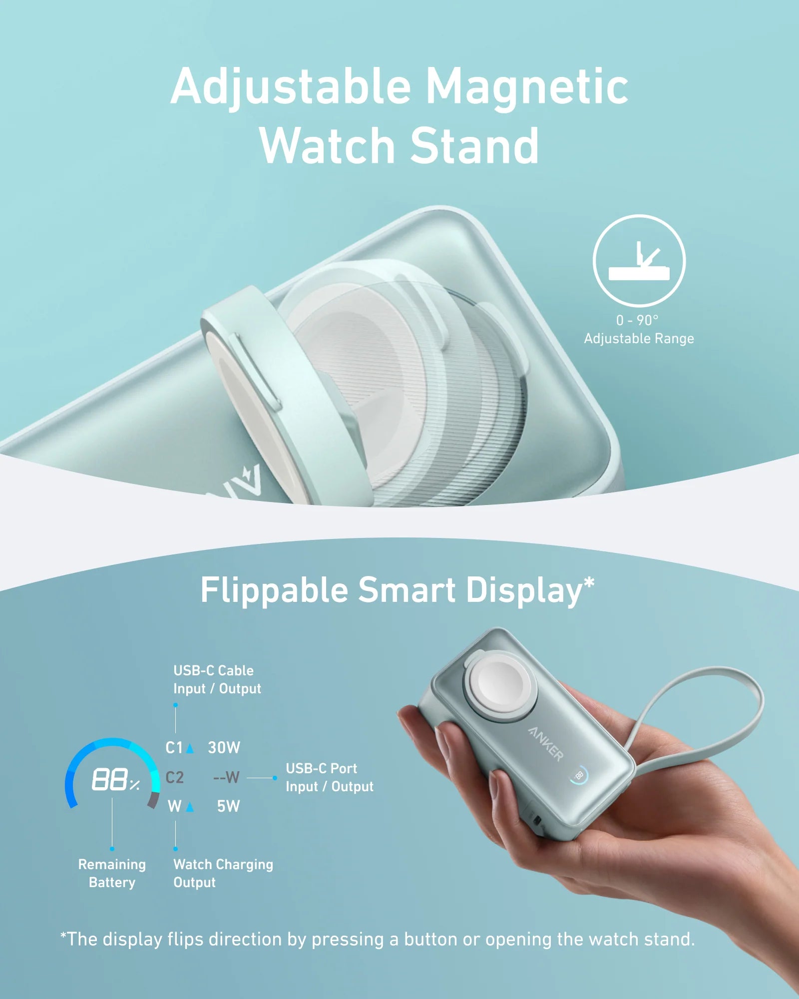 Supports simultaneous device charging with the built-in cable or port, offering up to 30W, alongside a wireless watch charger that provides up to 5W. The power bank fully recharges in 1.5 hours with a 30W maximum input.