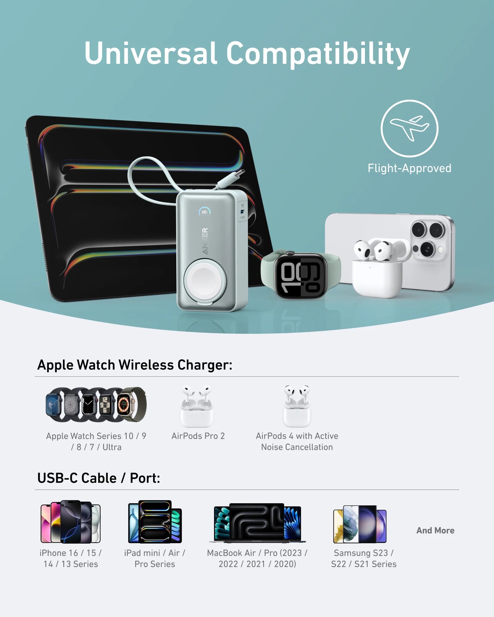 Compact as a standard mouse at just 3.7 × 2.0 × 1.3 inches, it fits effortlessly into pockets or bags. Fully flight-approved, the power bank offers hassle-free travel charging, providing about two full charges for iPhone 15 Pro and up to 11 charges for Apple Watch Series 9.