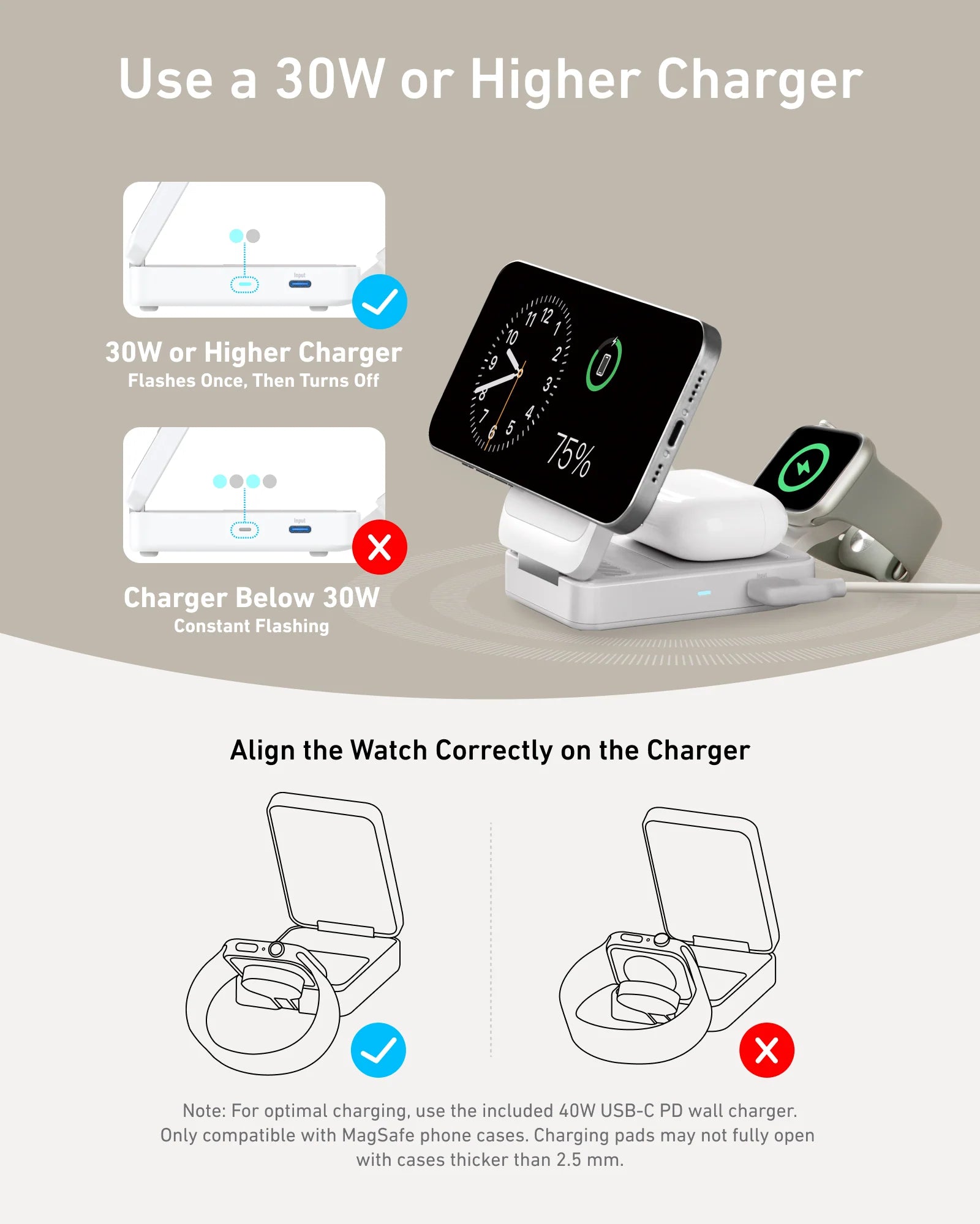 For the best wireless charging experience, we recommend using Apple's official magnetic phone cases. You should avoid cases thicker than 2.5 mm and non-magnetic cases, as they may affect charging efficiency.