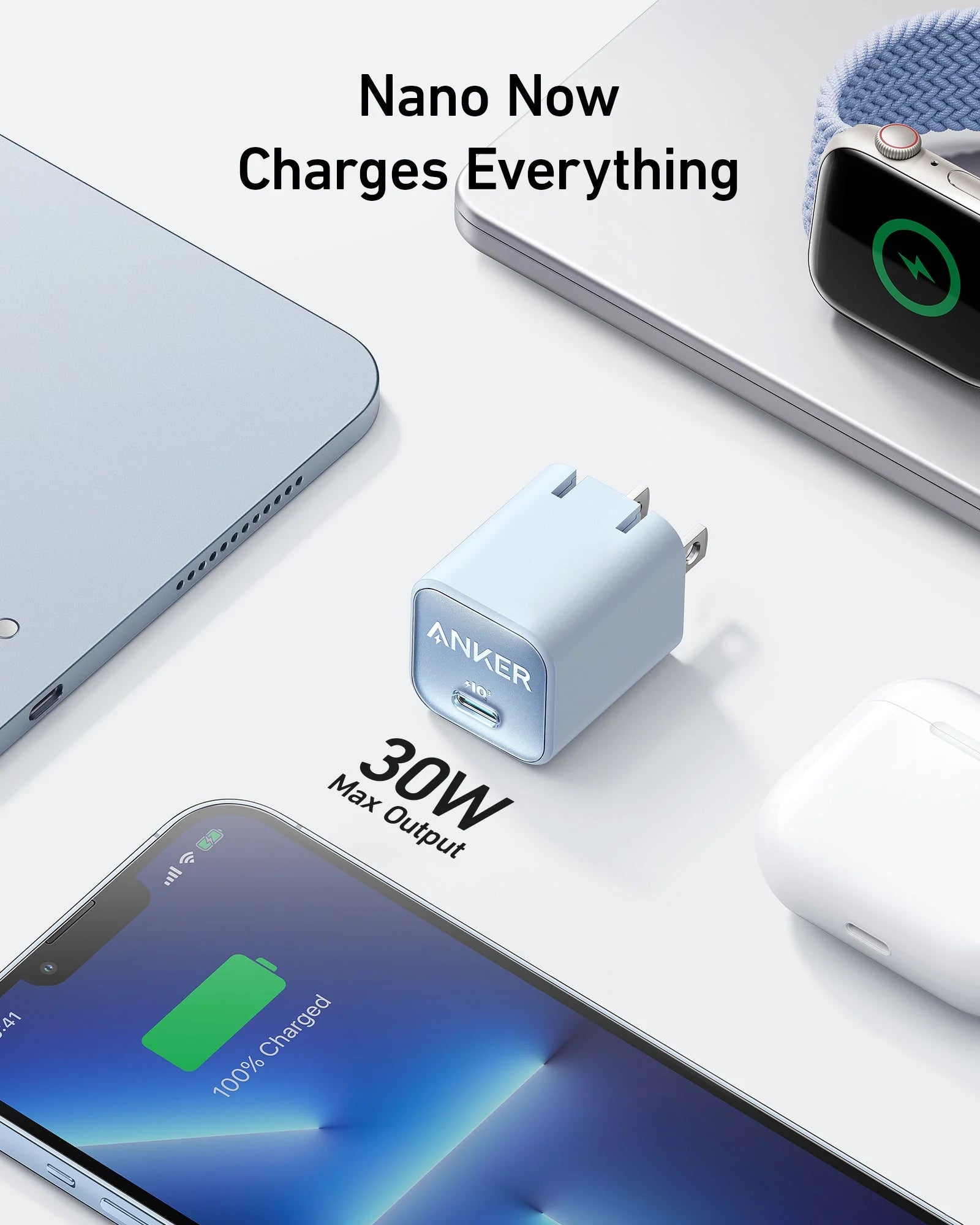 Upgraded with a 30W output so now you can charge your earbuds, phone, tablet, and even your MacBook Air with a tiny charger.