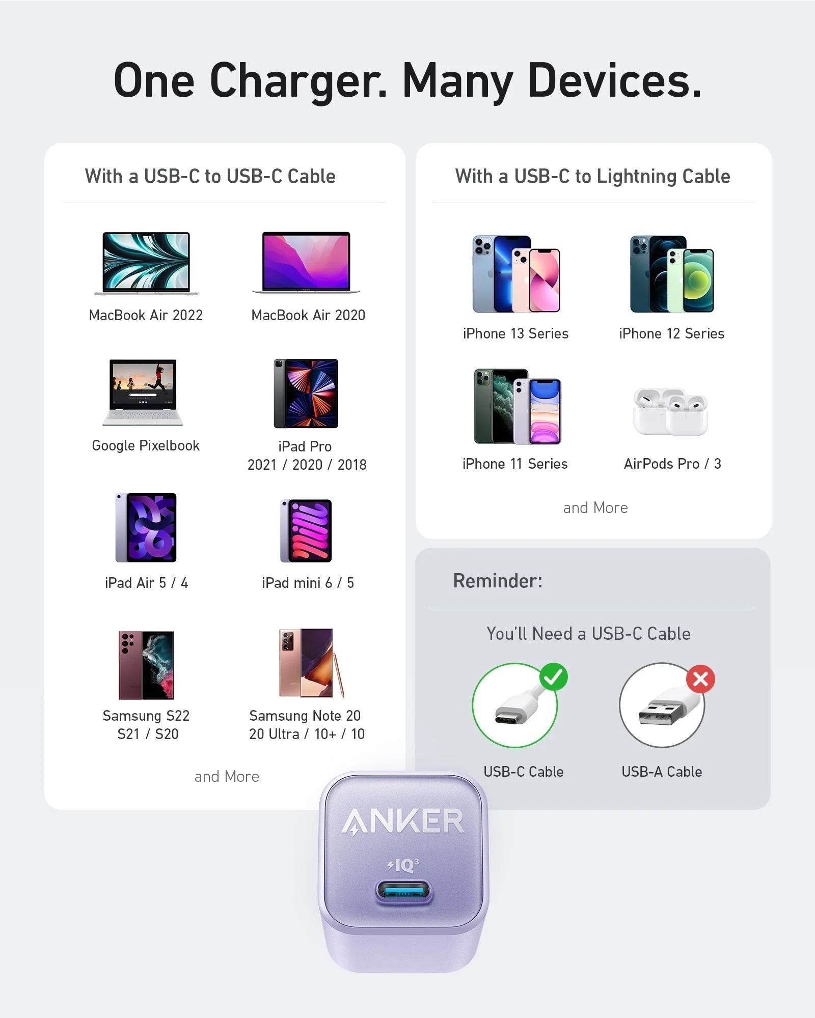 Anker 511 Charger (Nano 3, 30W) / Anker Nano Charger (30W), welcome guide, our worry-free 24-month warranty, and friendly customer service (cable not included).