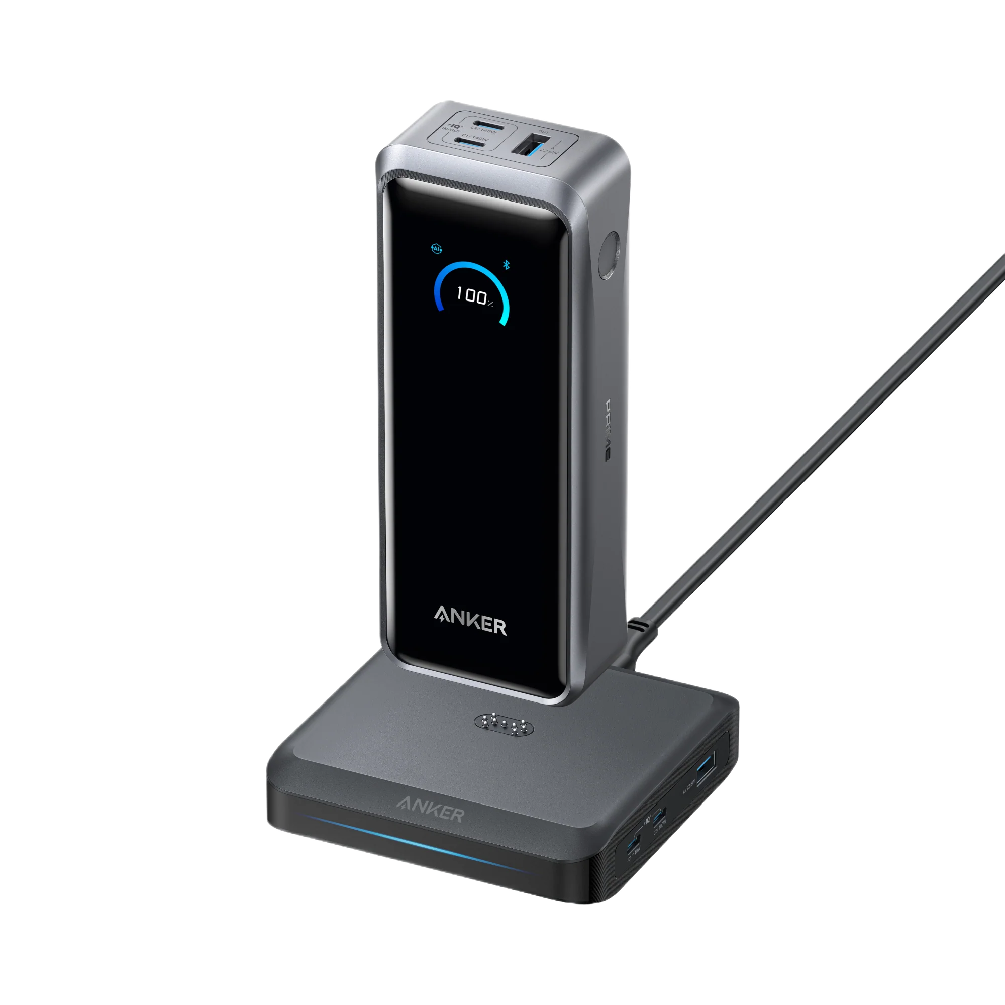 Includes dual USB-C ports and a USB-A on the power bank, plus three high-output ports on the base for full-speed multi-device charging.