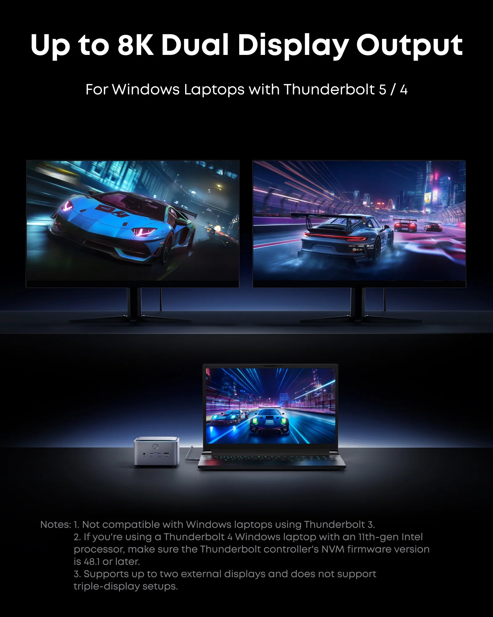 Supports one HDMI or DisplayPort and two Thunderbolt 5 downstream video outputs. Delivers up to 8K@60Hz for a single display, or dual 8K@60Hz for Thunderbolt 5 Windows laptops.