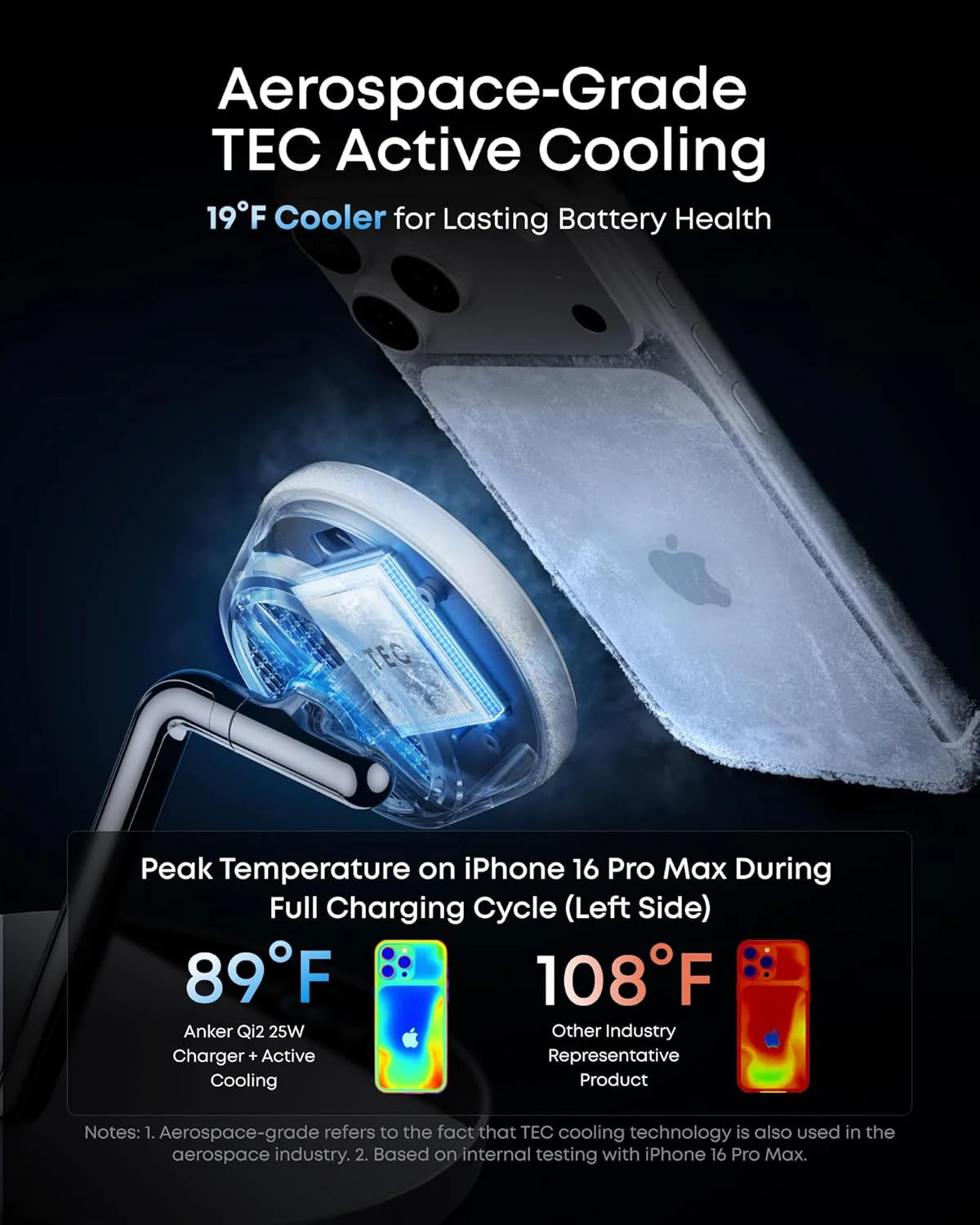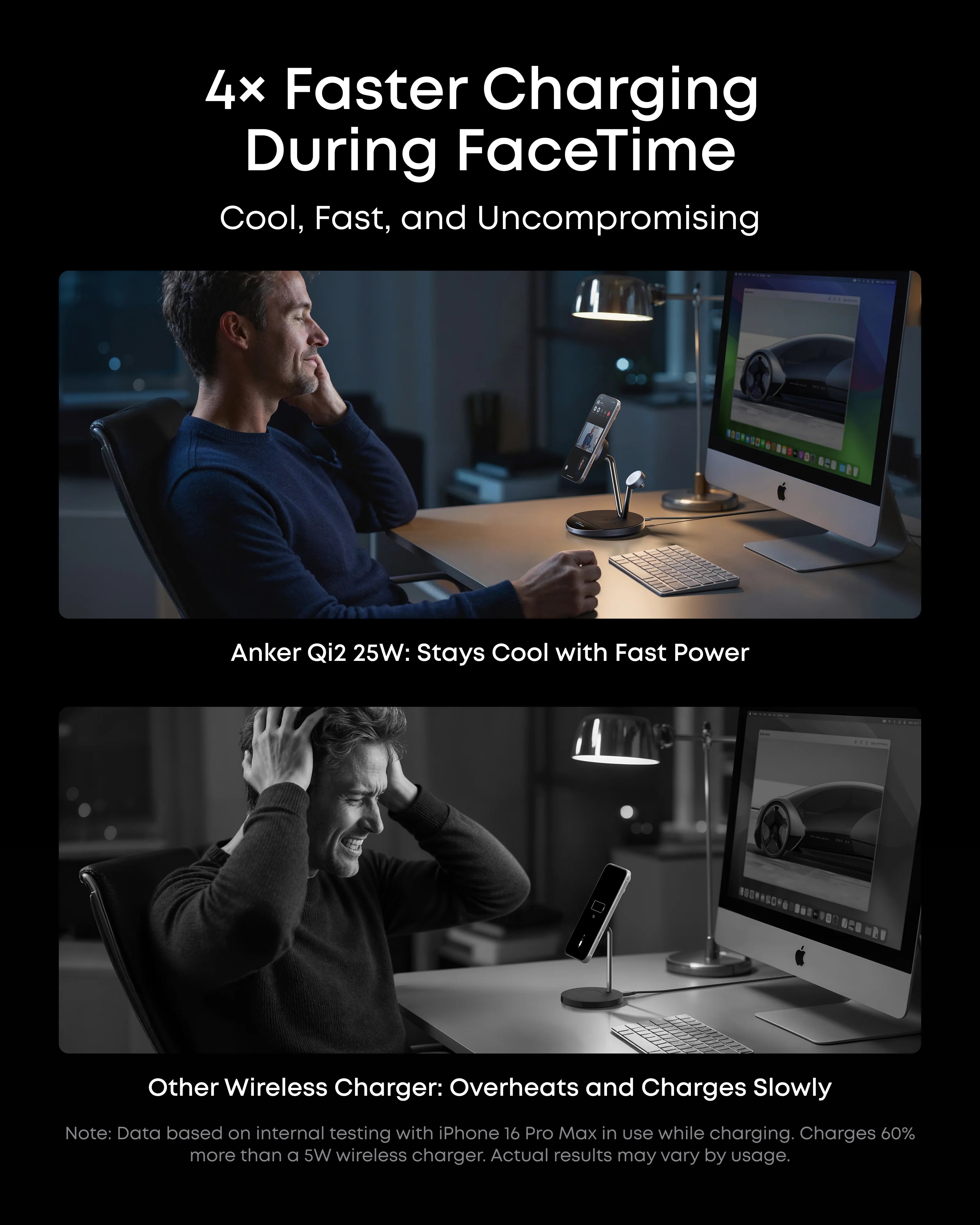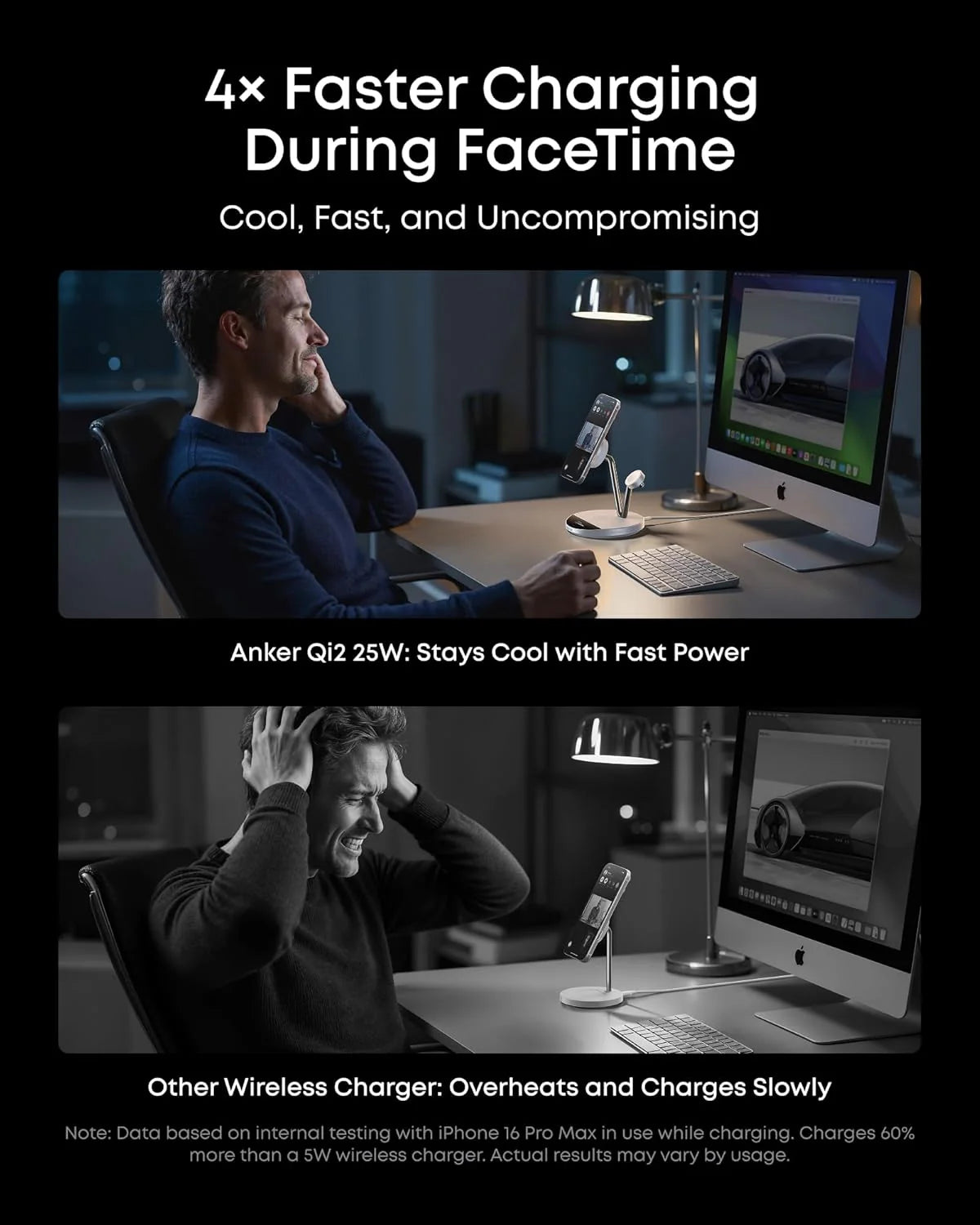 Charge your iPhone 17 Pro to 50% in just 22 minutes—exceeding the limits of standard 25W wireless charging with TEC active cooling. Enjoy wired-level speed with the convenience of wireless, up to 6× faster than 5W wireless. While charging and in use, stays cool and stable—up to 4× faster than 5W wireless. Actual performance may vary.