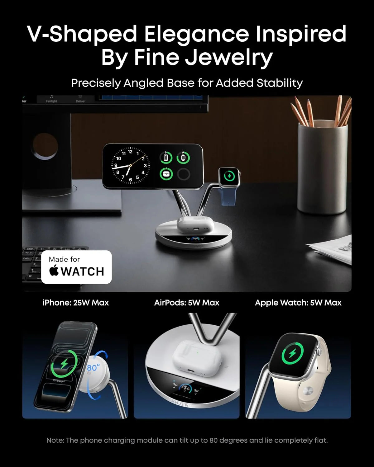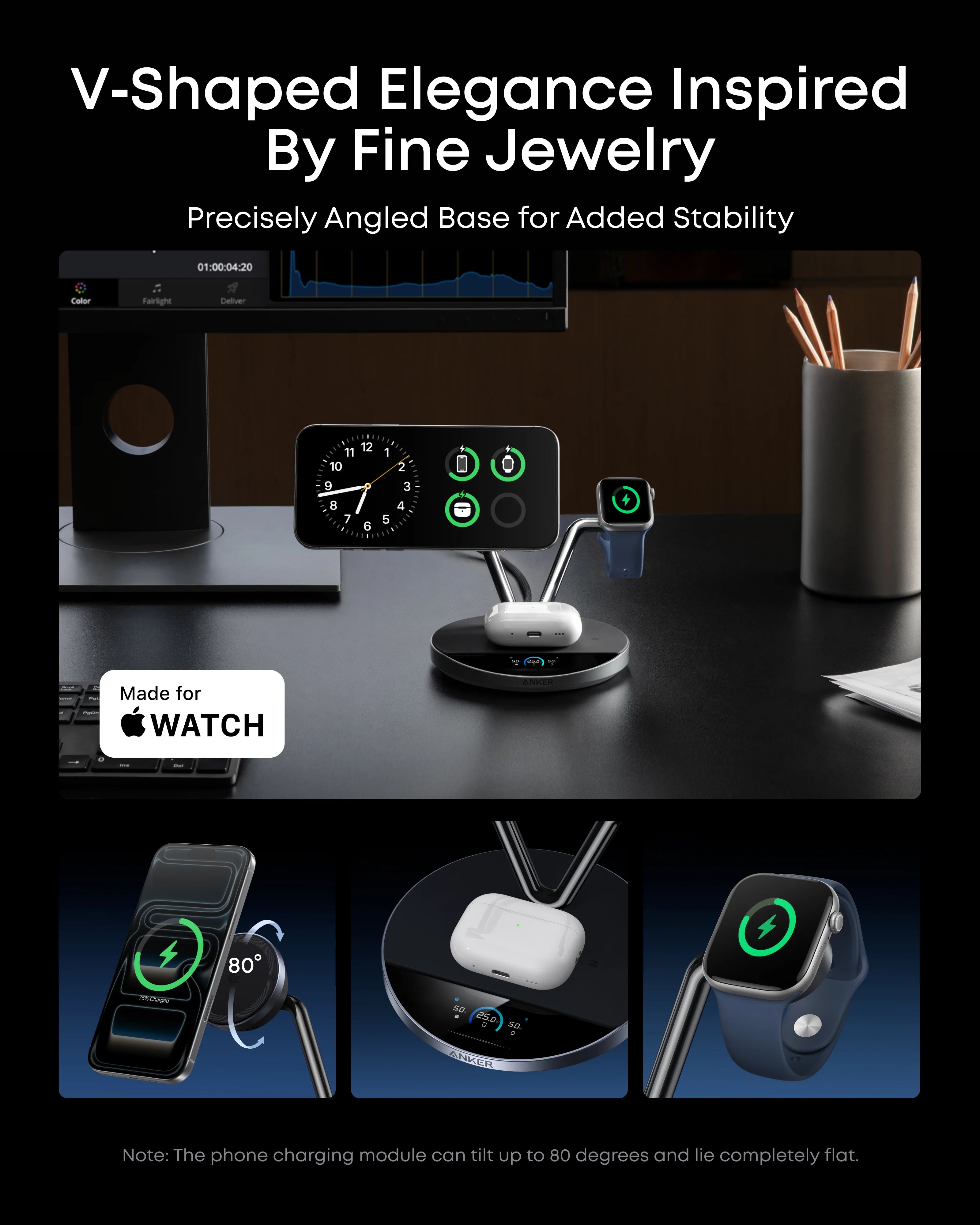 No. The watch charging module is fixed at 40° for stability, flattened by 5° versus the previous generation. To help prevent heavier watches from slipping, one anti-slip sticker is pre-applied and six spares are included for replacement as needed.