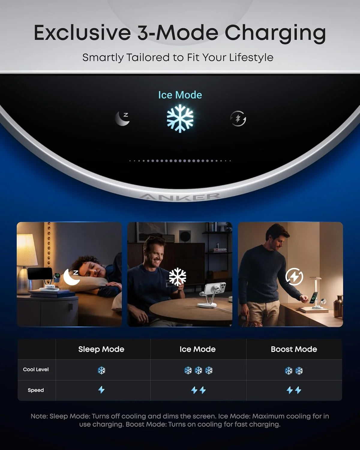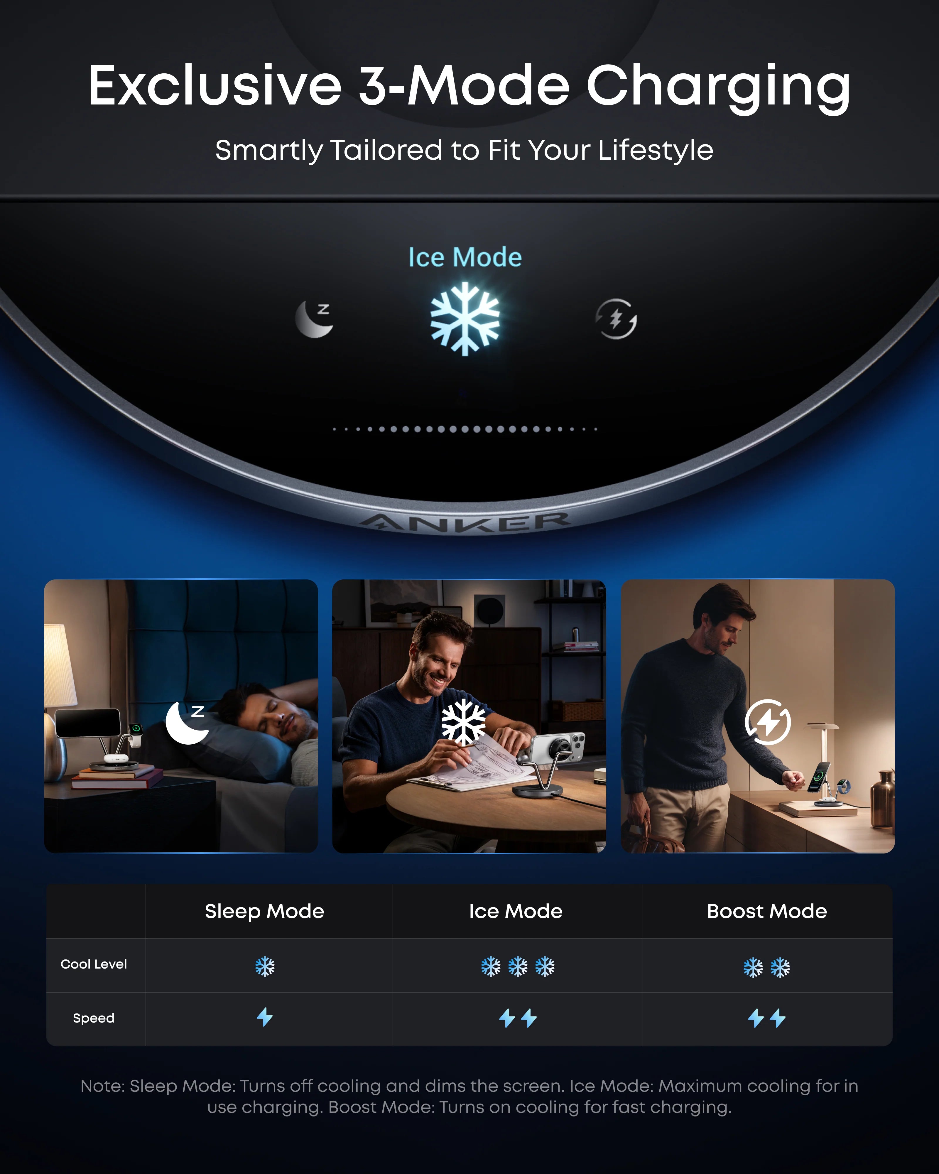 Switch between 3 smart charging modes to match your daily routine. Boost Mode delivers high-power charging to keep your phone cool during quick top-ups. Ice Mode provides maximum cooling with rapid charging performance, ideal for charging while in use. Sleep Mode turns off cooling and dims the display for quiet overnight charging.
