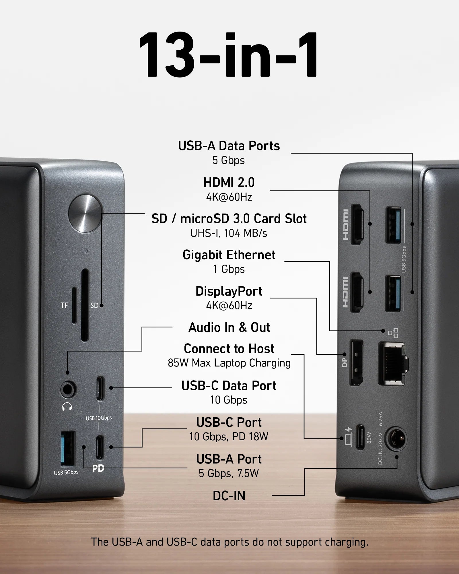 This dock supports up to 85W of charging via the USB-C upstream port on the back of the dock (indicated with a computer icon). The USB-C Power Delivery port (indicated by “PD”) supports 18W fast charging for your phone or tablet. The USB-A 3.0 port on the front supports 7.5W to charge smaller devices like smartwatches or headphones. The two USB-A data ports on the back of the dock do not support charging.