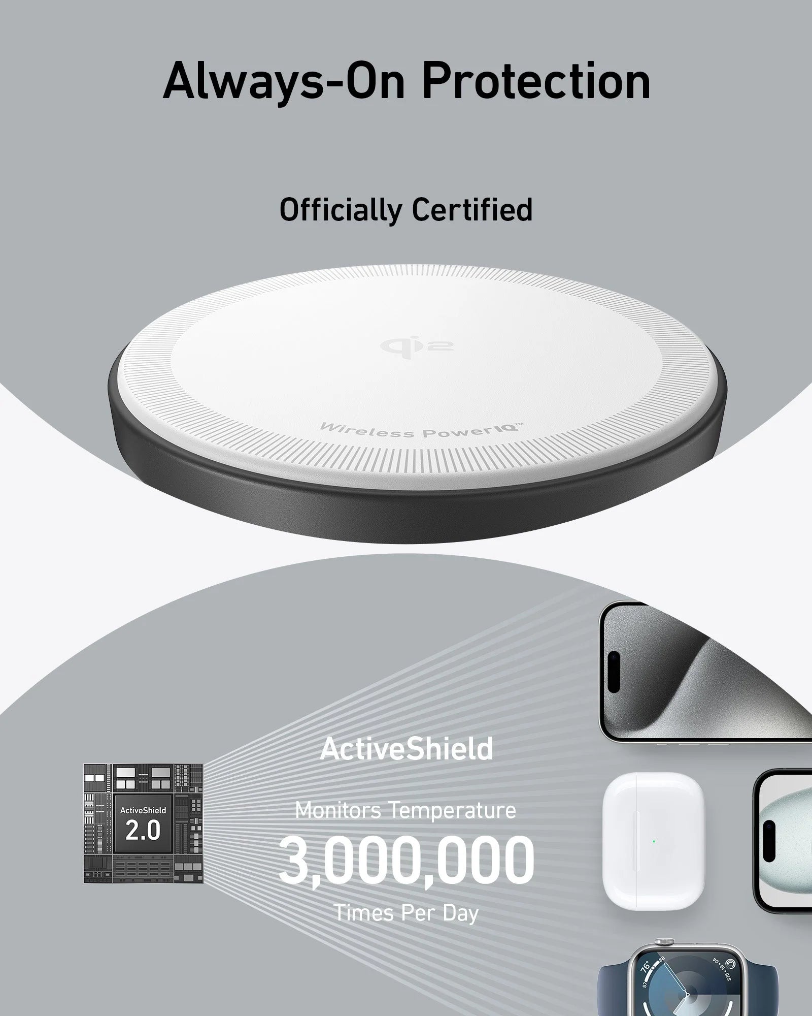 Rely on Anker's proprietary ActiveShield technology which monitors temperatures over 3,000,000 times per day to ensure the safest charging.